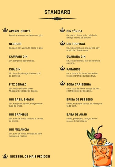 Carta com 15 opções de drinks diferentes para você escolher os seus preferidos.